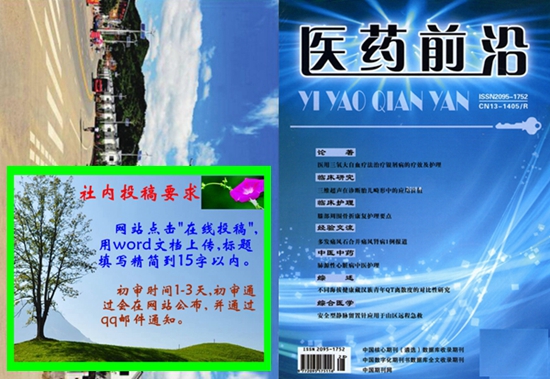 《医药前沿》杂志坚持致力于医学理论与医疗实践的新发现、新突破,竭诚为各级医疗机构、医学研究单位、医药管理部门的医务人员、科研人员、管理人员服务,为其总结实践经验、发表学术研究成果提供一个交流的平台,以促进中国医学事业的不断发展。本刊容量大,发表快,具有学术权威性。在本刊发表的学术研究论文可在职称评定、晋升业绩考核以及岗位竞聘中起到科研认定作用。欢迎全国广大医务工作者、科研机构研究人员、大中专医学院校师生踊跃投稿!